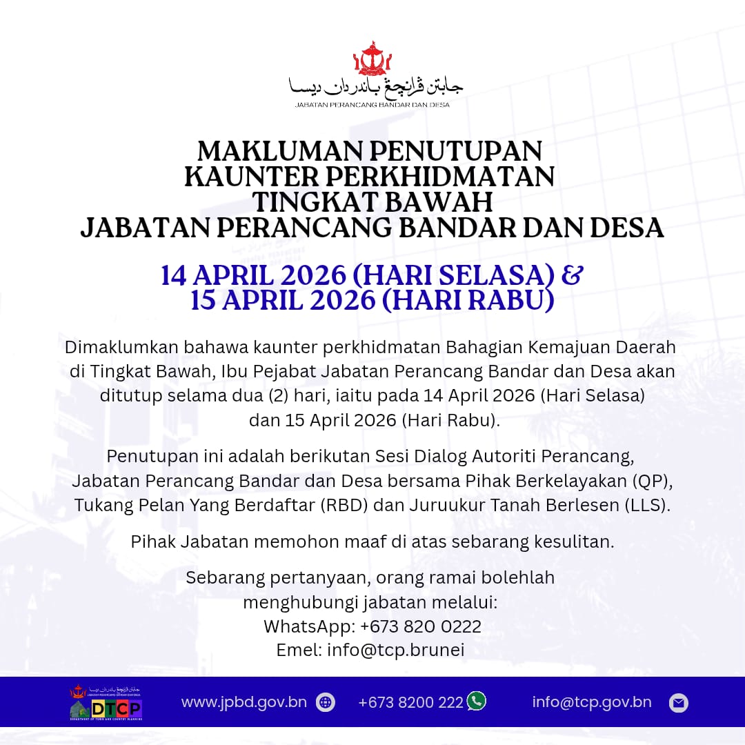 Dimaklumkan bahawa kaunter perkhidmatan Bahagian Kemajuan Daerah di Tingkat Bawah, Ibu Pejabat Jabatan Perancang Bandar dan Desa akan ditutup selama dua (2) hari, iaitu pada 14 April 2026 (Hari Selasa) dan 15 April 2026 (Hari Rabu)..